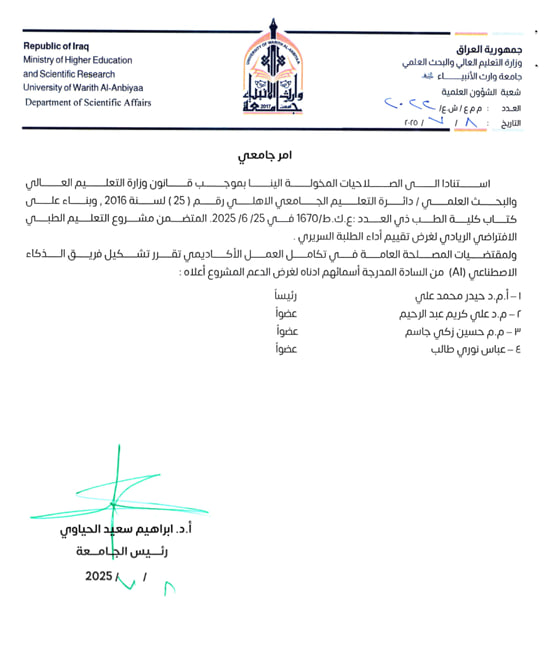 On Wednesday, 9/18/2024, Prof. Dr. Adeeb Ahmed Al-Zubaidi, Head of the Department of Pharmacology at the College of Medicine - Warith Al-Anbia University (peace be upon him), participated as a member and supervisor in the committee to discuss the thesis of the doctoral student (Raed Saad) in the Department of Pharmacology - College of Medicine / University of Nahrain, entitled: