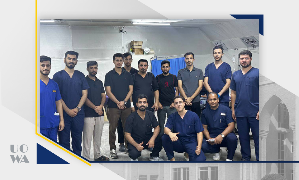 Amidst the sublime spiritual atmosphere of the immortal Arbaeen pilgrimage, the Deanship of the College of Medicine at Warith al-Anbiya University extends its highest expressions of appreciation, pride, and respect to our dear students participating in the medical service detachments deployed along all pilgrims' routes. We express our deep appreciation for the time, effort, and expertise they have devoted to treating, curing, and alleviating the pain of the honorable pilgrims. This would not have been possible without the desire, knowledge, and skill of this good group of our sons and daughters, which enabled them to perform this great task. The evaluations we received from the doctors supervising the work of our volunteer students were wonderful and a source of pride for us all. All supervisors noted the high discipline of our dear students, in addition to their academic potential and clinical skills, which qualify them to work at all times and under the most difficult conditions. This undoubtedly reflects the efforts of the college's professors in training and developing the theoretical, practical, and clinical skills of our dear students. This would not have been possible without the continuous support and ongoing supervision of the esteemed University President. In conclusion, we can only say: