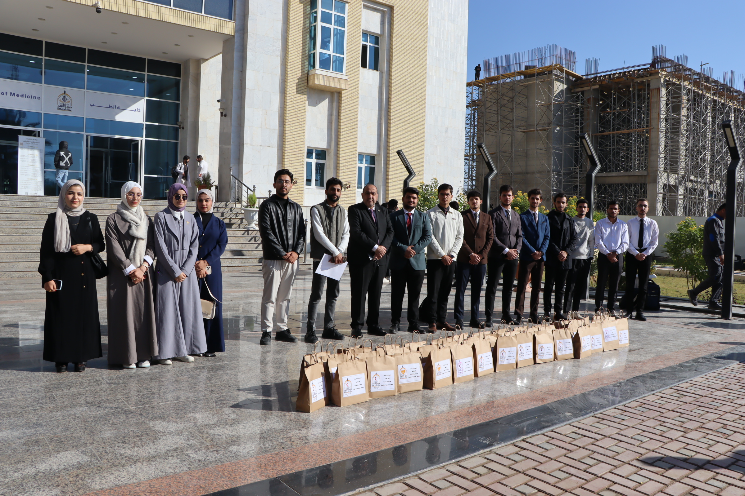 Under the patronage of the esteemed University President and the supervision of the Dean of the College of Medicine at Warith Al-Anbiya University, second-year students organized a field visit to the Children's Hospital in the Holy City of Karbala. During the visit, a number of students visited the hospitalized children, presenting them with gifts and offering them moral support, bringing joy and happiness to their hearts. This visit is part of the humanitarian activities organized by the college to enhance the spirit of cooperation and responsibility among students and to develop their social and humanitarian awareness.