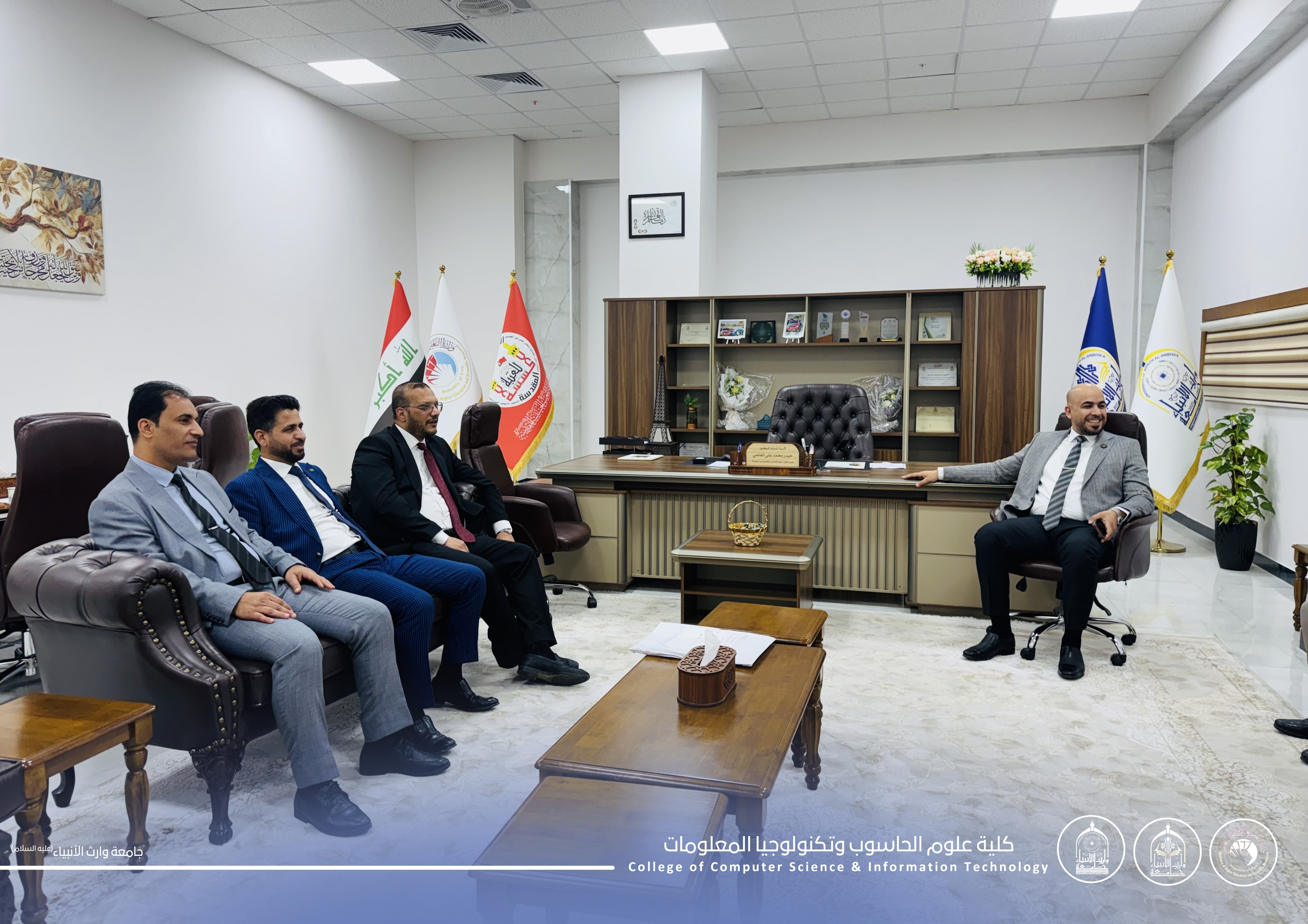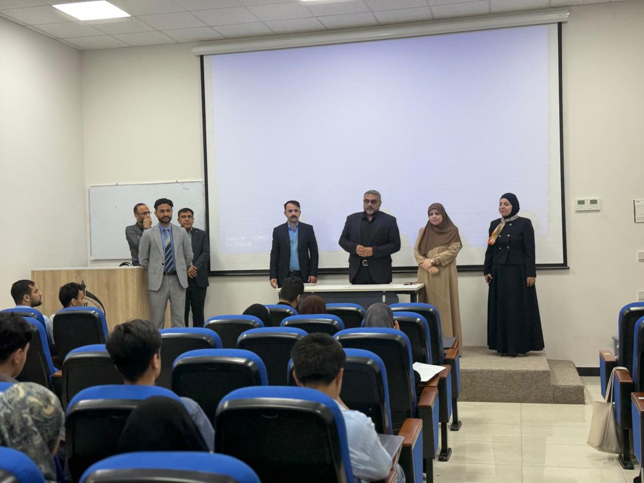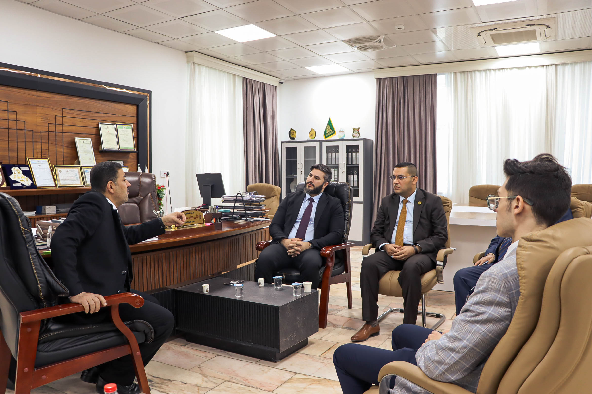 Within the framework of field follow-ups on student affairs, the Dean, Assistant Professor Dr. Laith Mohammed Abbas Al-Husseini, held an extensive meeting with first-year student representatives. The meeting, attended by the Head of the Student Affairs Division, Asst. Lect. Ali Aziz Kadhim, aimed to monitor the educational process and guide the academic path of new students.