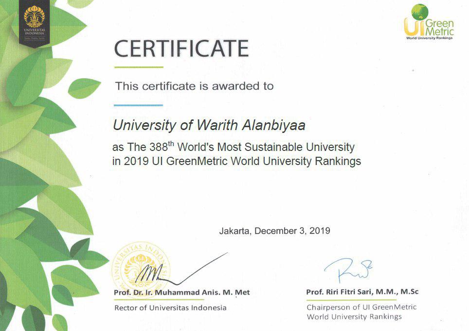 With the distinguished efforts from the unit of World Rankings at the Department of Quality Assurance and Performance Appraisal and with great support from the university Chancellor and from the scientific assistant, the University of Warith Alanbiyaa was ranked as the 388th World Most Sustainable University among 780 participating universities and the 6th in the country (Iraq) among 44 Iraqi participating universities.