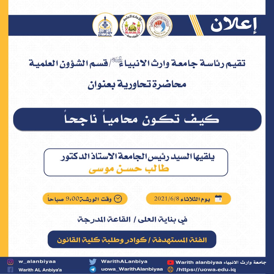 In order to open the door of cooperation between the University of Warith Alanbiyaa and the Court of Karbala, especially that the university includes the college of Law in its formation, the President of the University Mr. Talib Hassan Musa visited the Karbala Court. The President of Karbala Court Mr. Hamza Aboud and his assistants welcomed the visit and said