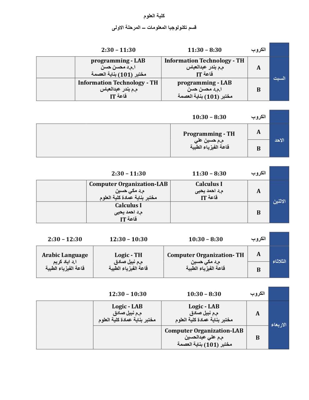 Weekly Schedule for First Year Students in the Information Technology Department