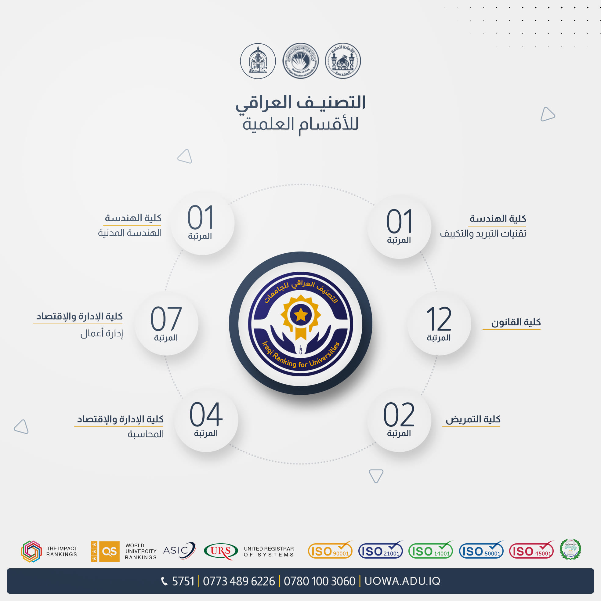 The Ministry of Higher Education and Scientific Research, through the Scientific Supervision and Evaluation Agency, announced the results of the "Iraqi Ranking for Academic Departments" for both government and private universities. University of Warith Al-Anbiyaa (peace be upon him) excelled in achieving notable accomplishments in various specializations.